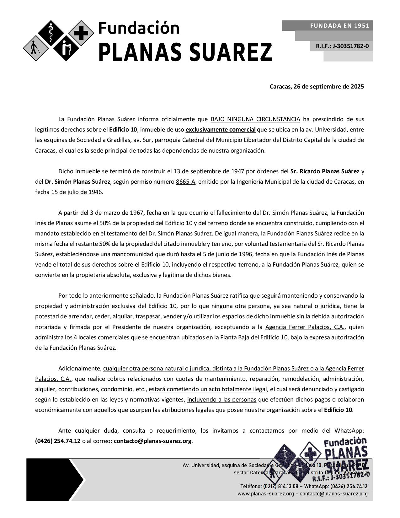 todos los asuntos concernientes a la Fundación Planas Suárez serán atendidos por la